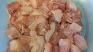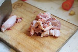 鸡肉切成鸡丁放入水中煮三分钟,捞起