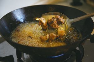 油锅烧至七成热,放入腌制好的鸡块油炸,炸至金黄。可根据个人口味,喜欢焦脆一点的就多炸一会。炸好以后捞出备用。