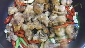 然后加入炸过的鸡肉块,同时加入椒盐均匀翻炒。