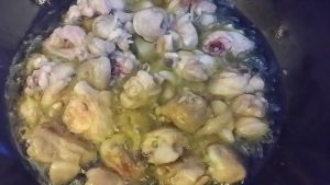锅中倒入食用油烧热,放入鸡腿块,炸制颜色变金黄,捞出沥油备用