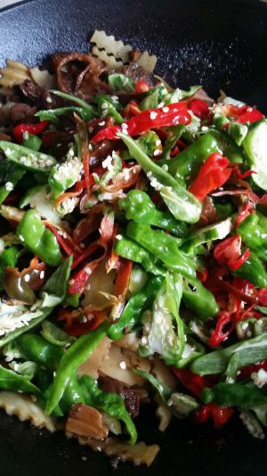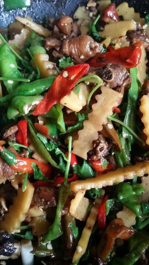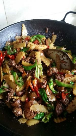 之后倒入辣椒炒,然后倒入鸡肉,+一小烧糖,一勺盐,最后快炒好的时候放葱,就好了