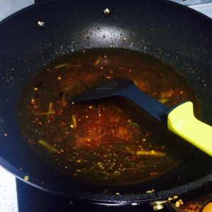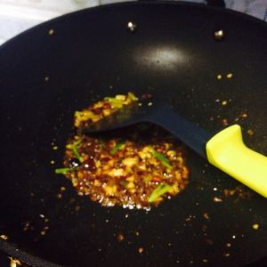 继续热锅,小火炒葱姜蒜,加两勺郫县豆瓣酱,豆瓣酱有点咸,可以根据自己的口味添加,但是少了出不了红油的感觉,煸炒一下,红油出来加一碗水,加盐和酱油,大火烧开。