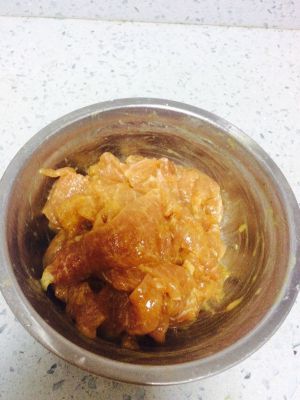 里脊肉切薄片,加一点胡椒,盐,酱油和淀粉,加少量水抓匀,再放点油拌匀,腌制一会。