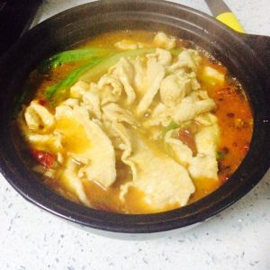 红汤烧开,把腌制好的肉片放入锅中煮熟,不需太久,基本熟了就可以了,煮久可能会老。将肉和汤倒入备好碗或者小锅里。
