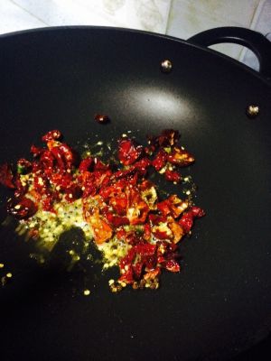 准备炒菜啦!热锅凉油,油可以根据辣椒的多少开放,小火煸炒花椒和辣椒,等香味出来,辣椒有点脆了就可以盛出备用,油留锅里等下炒豆瓣酱用。记住不要炒糊了哦!