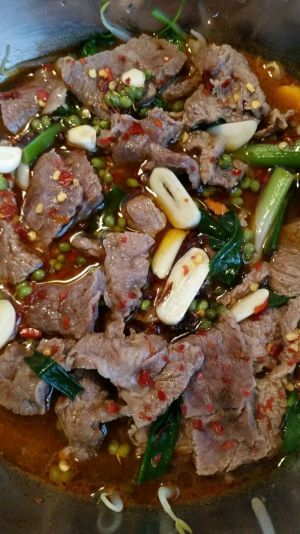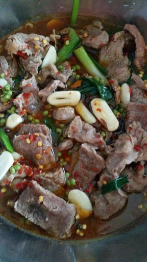 锅烧热加油,火锅料,青花椒,葱姜蒜炒香 ,放酱油,盐,糖,热水煮开,加入控干水份的牛肉片,煮熟后连汤一起倒在豆芽盘中。