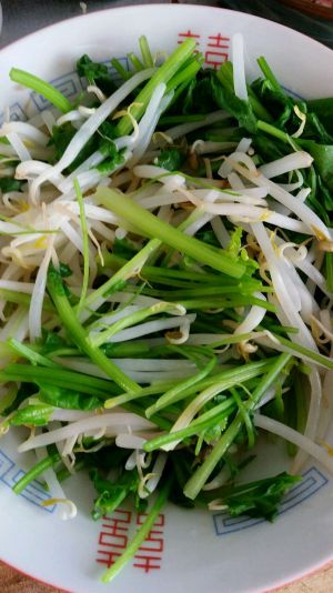豆芽芹菜入沸水锅焯至断生捞出装盘
