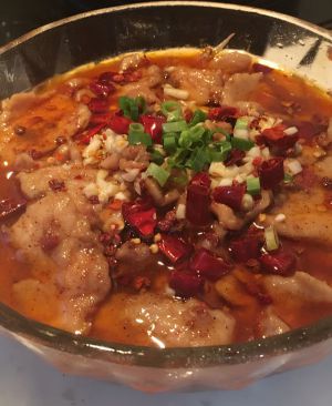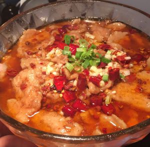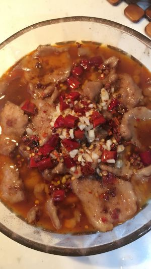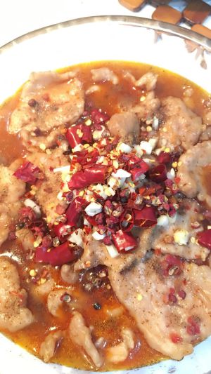 撒上花椒面辣椒面,芝麻,油入锅烧热浇在水煮肉片中,完成。