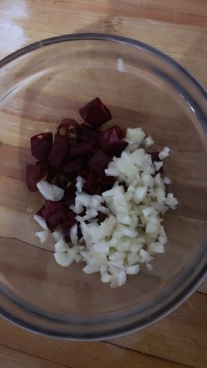 另起油锅,多放些油,入干辣椒和花椒,五分火烧热后淋入大碗。