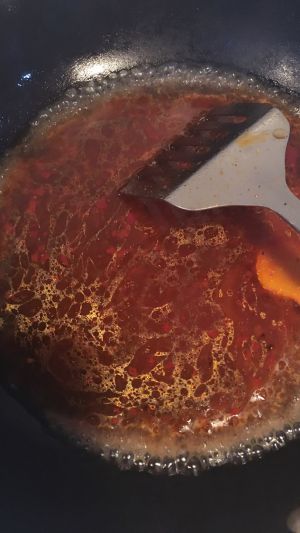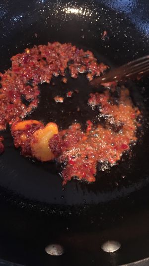 锅热后下小半碗油,将豆瓣,大蒜,花椒下锅炒香。加水,放入朝天干辣椒,小火熬10分钟。