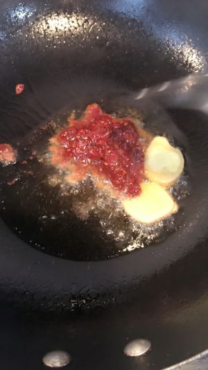 锅烧热油五分火加入豆瓣酱、姜丝、拍扁的蒜瓣,炒出红油后加适量开水转大火煮沸,加适量盐和老抽