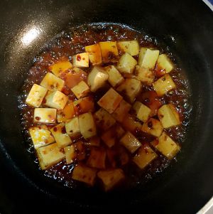 捞出豆腐沥干水分。锅内放油,倒入豆瓣酱炒香,将豆腐倒入锅内。用铲的背面轻轻翻动豆腐,同时放入适量适量生抽,盐入味。