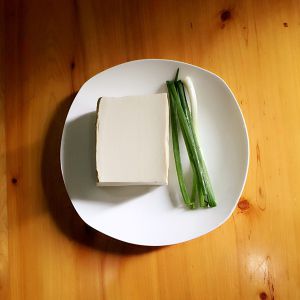 嫩豆腐切成小块。千万不要用老豆腐,北豆腐。