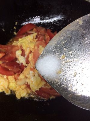 西红柿和鸡蛋翻炒均匀加入白糖和少许盐 不用添加其他调料 多翻炒一会 西红柿要炒的变软才行
