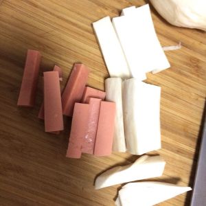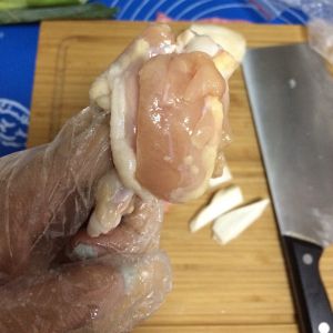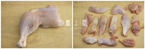 鸡全腿一只,去皮去脂肪块;去骨头,把鸡腿肉切大概5厘米长