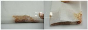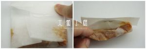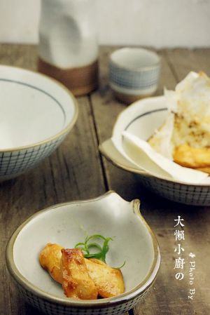 鸡腿肉用辣酱和蚝油腌制15分钟;提前准备好油纸,大概是12厘米的正方形,把一块鸡腿肉放下去