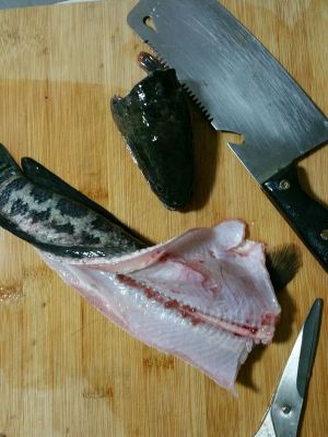 这次选的是一条二斤半的草鱼,鱼处理好后(内脏黑膜处理干净,腥线摘除)贴着鱼骨把鱼肉剔除,鱼肉片成片(只要刀锋利很好弄,不需要太薄,如果不方便可以直接剁成大块),鱼骨剁大块儿。鱼肉腌制十分钟,一勺盐,一勺胡椒粉,两勺生粉,料酒少许,鸡蛋清一个。