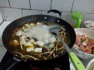 水开,放入折耳根,豆腐,土豆,这些配菜可根据自己喜好选择