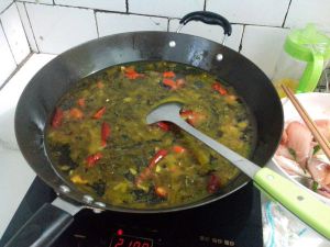 酸菜炒到闻到酸辣的味道,放入开水,加上调料,糖盐排骨汤鸡精,不时的尝尝,味道酸甜差不多就好!
