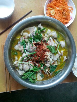 豆芽煮熟后捞出放入鱼肉煮大约5分钟,取装菜的器皿将豆芽放在底部,然后放入鱼骨鱼头和酸菜!