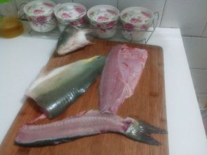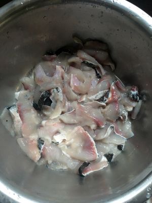 将鱼洗净,片开,鱼头和鱼骨先剁碎放入盐腌制
