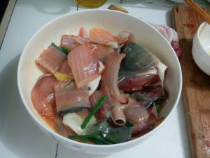 鱼头 鱼排 鱼片分别用料酒 盐 胡椒 蛋清 淀粉腌制(也可一起腌制)