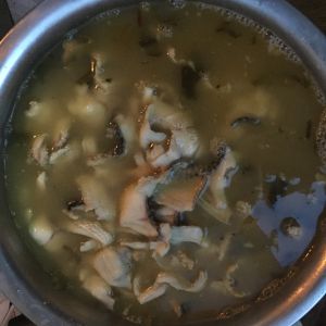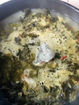 一个小时后,开火葱姜蒜爆香酸菜包,炒熟后加热水,水开后先下鱼头鱼骨,煮熟后下鱼片,变色熟了即可盛出来,撒上香葱,炒熟的白芝麻,再另起一锅烧热油,淋在鱼身上即可(爱吃辣的可以最后油炸花椒,辣椒浇在鱼上)