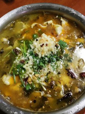 然后起油锅加入花椒干辣椒适量蒜末,炒至出香淋在酸菜鱼上即可