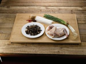 准备好食材 鸡肉切块,香菇切成两半,土豆切块,葱切段,姜切片,蒜切块.
