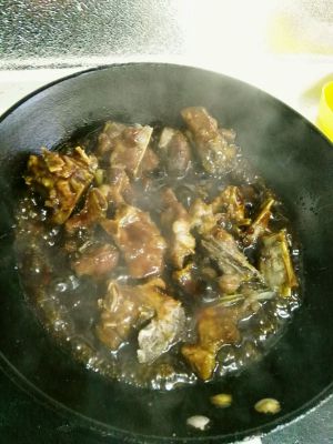 起锅大火放油 下生姜、桂皮、八角,小葱,香叶爆炒1分钟 放入晾干的排骨 继续翻炒至双面发黄,加水 漫过排骨 大火烧沸腾,加入白糖/冰糖适量、白醋适量、老抽少放一点、蚝油、盐,随后大火转小火烧30分钟。