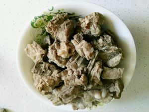 将排骨剁块,洗好,起锅放水与排骨一起加热至沸腾,捞出过冷水洗净 晾干。