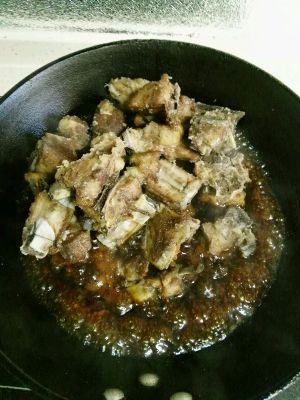 成琥珀色时下入排骨,翻炒均匀