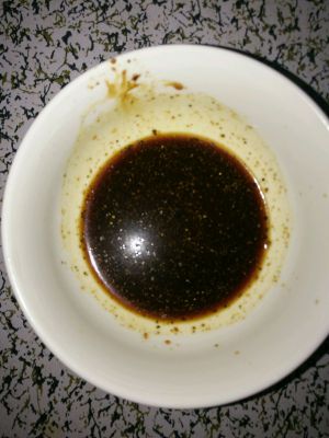 调碗汁。因为腰花要大火爆炒,炒的时间很短,所以最好把调料调好一起倒入,节省时间。碗汁:盐、糖、胡椒粉、味精、老抽、料酒、蚝油、淀粉,加少许水,搅匀备用。