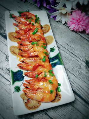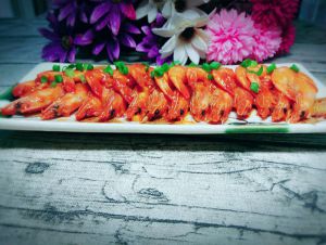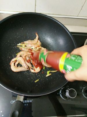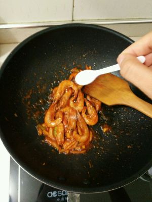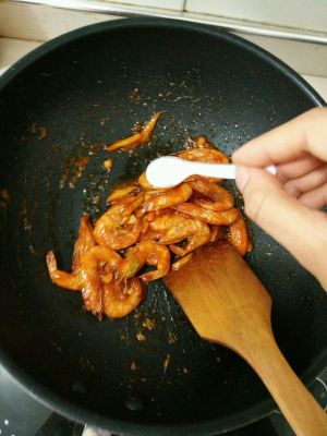 锅内留少许底油,放入糖炒至粘稠,把过油的虾和姜丝下锅,加盐、糖、味精调味;
