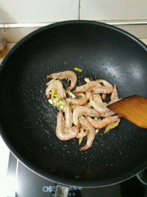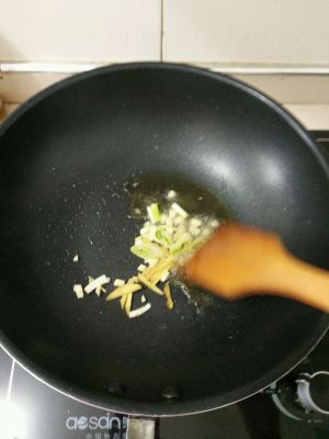 锅中留少许虾油,放入葱段和姜片。炒出香味。
