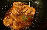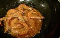 投入大虾,沿锅边烹入少许料酒、生抽(不能是深色酱油),洒入约3小匙白糖,以炒勺轻压几下虾脑,挤出红汁,大火炒匀,倒入约小半碗温水,大火烧开,小火盖闷