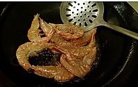 下油,略有烟,下冰糖炒黄,下配料炒香,下虾把壳煎酥些,下生抽老抽,鸡精。中火炒。