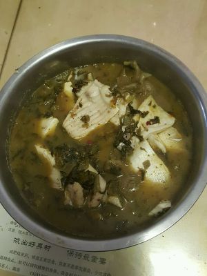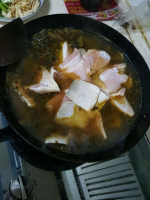 把买回来的鱼骨和鱼肉分开来洗,鱼骨鱼肉洗好甩掉水分别放一边。 2.酸菜切小块,葱切段,姜切片,蒜拍开去皮。 3.起火热锅下油,油热好开始煎鱼,鱼放点淀粉下锅煎,鱼煎好起锅放盘。煎鱼剩下的油可以放葱姜蒜炒想放酸菜,炒一下加点醋再炒一下接着放鱼下去煸炒。加水熬汤。 (小编在这里强调,因为自己觉得酸菜不够酸菜放的醋) 4.熬汤同事我们来做鱼肉了,鱼肉加点盐抓一遍,换水两遍抓。甩干水放碗,放适量盐,胡椒粉,淀粉,鸡蛋清抓均匀。 这是熬的汤刚好煮开了,先捞起鱼骨酸菜盛入锅中。放入腌好的鱼肉,放进锅就不要搅动汤肉,锅盖等开就可以盛锅。 5.锅洗净放油热锅下葱蒜沫花椒炒香。淋入锅中。