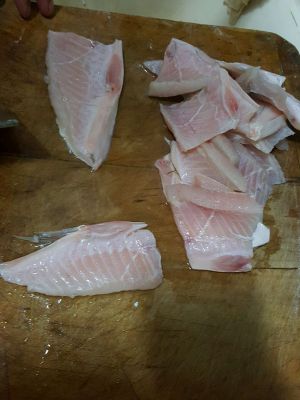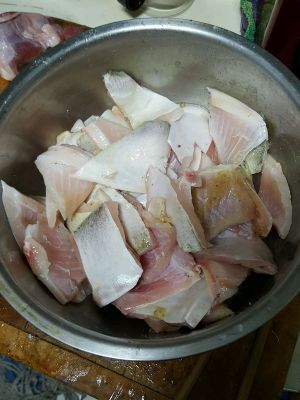 鱼片儿放入盆中,用料包中的腌鱼料和少许料酒腌上10分钟。