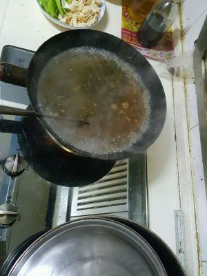 加入料包,把鱼片儿放入,煮三到五分钟,撇去浮末。