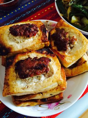 豆腐块中倒入肉馅,锅中倒鸿禧牌食用油,小火煎至两面金黄