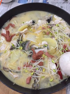 热锅,下油,热油后把配料姜泡椒萝卜片加入翻炒1分钟后加入鱼骨翻炒到鱼骨表明熟后加入适量盐随后➕开水,然后把肠仔,土豆,香菇,豆芽加入、待滚开后加入鱼片,加鱼片后半分钟熄火加盖焖2分钟即可食用.
