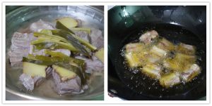 排骨洗净,锅里放适量油,排骨倒锅里翻炒,加入生姜 葱段,排骨煎至两面金黄