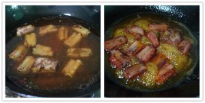 把调好的料酒1,酱油2,白糖3,醋4,倒进锅里翻炒,直到排骨上色,再加入水淹没排骨