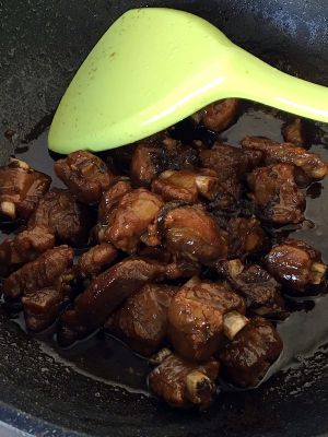 锅烧热,下排骨煸炒出油,选有点肥肉的腩排,炒到肉有点变黄,喷点料酒继续翻炒,接着下李锦记特级头抽和蚝油翻炒均匀,盖上盖子转最小火焖,隔一分钟开盖翻炒几下防止煳锅