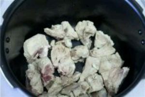 开锅后捞出排骨,冲洗干净表面的浮沫,放入内胆中。