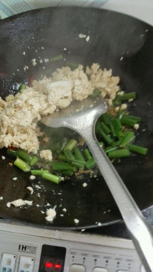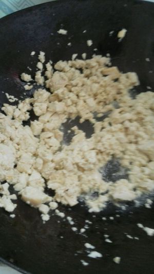 锅内放油,臭豆腐入锅翻炒碾碎,再出盘
