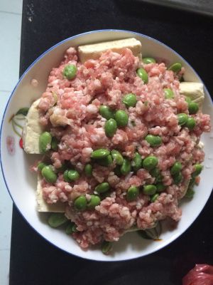 肉糜伴上葱(增香)、黄酒(去腥)、盐(调味)和毛豆(增加口感)搅匀,其实也可以拌上萝卜干,既可以调味又可以增加口感,我弄的时候忘记了,所以萝卜干是铺在表面的,味道差点