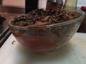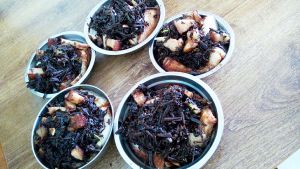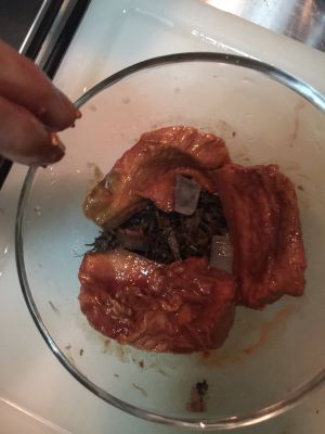 蒸半小时,加入泡好炒好的梅干菜,加蒜末,蒸一小时