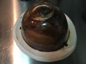 面上铺满梅菜,从玻璃碗侧面看,下面是肉上面是梅干菜